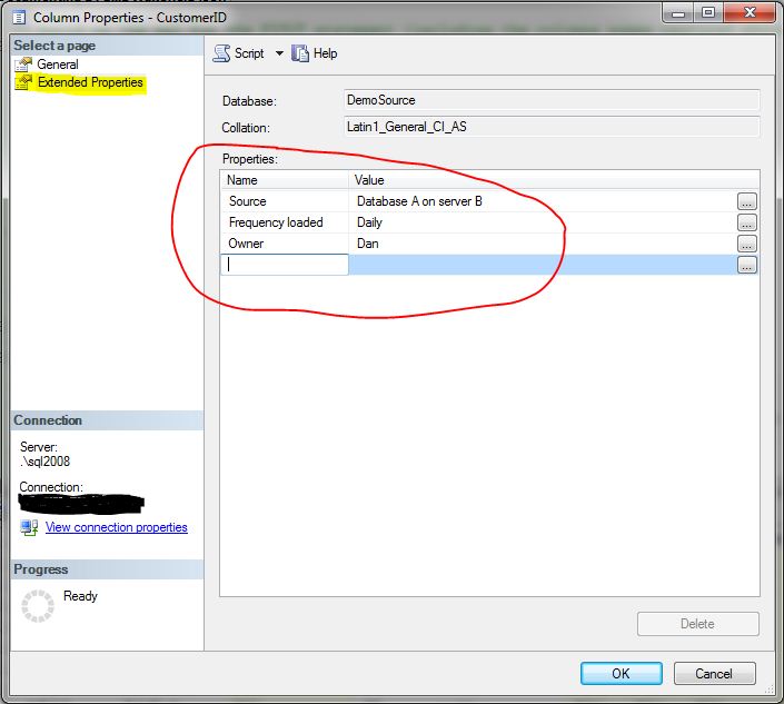 You can add all the extra meta data you require here specific to your project, in this example I’ve added 3 extended properties – Source, Frequency loaded and Owner. I’ve then given these properties values for this particular column.